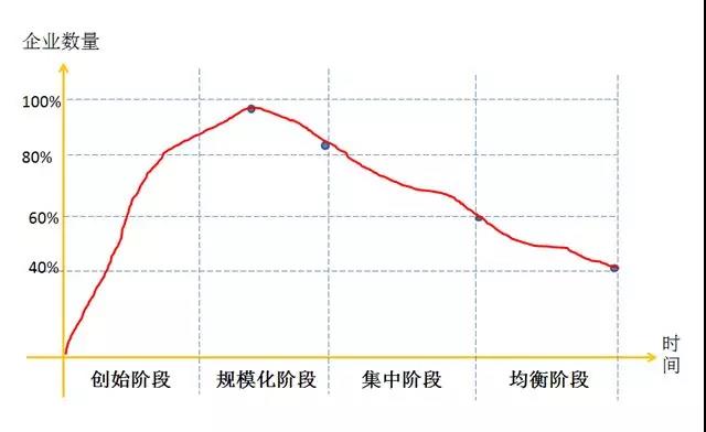 在一個(gè)行業(yè),從長期看,企業(yè)要存活下來就要有超出平均水平的成本控制能力。管理學(xué)家陳春花認(rèn)為一個(gè)行業(yè)內(nèi)企業(yè)數(shù)量和時(shí)間軸之間的關(guān)系可以通過四個(gè)發(fā)展階段來說明:初創(chuàng)階段、規(guī)模化階段企業(yè)數(shù)量一直上升,規(guī)?;笃谄髽I(yè)數(shù)量達(dá)到頂峰,開始有擠出效應(yīng),約20%企業(yè)出局,到集中階段又有20%企業(yè)出局,到均衡階段還要淘汰20%,最后的競爭就在剩下的40%企業(yè)之間展開。
